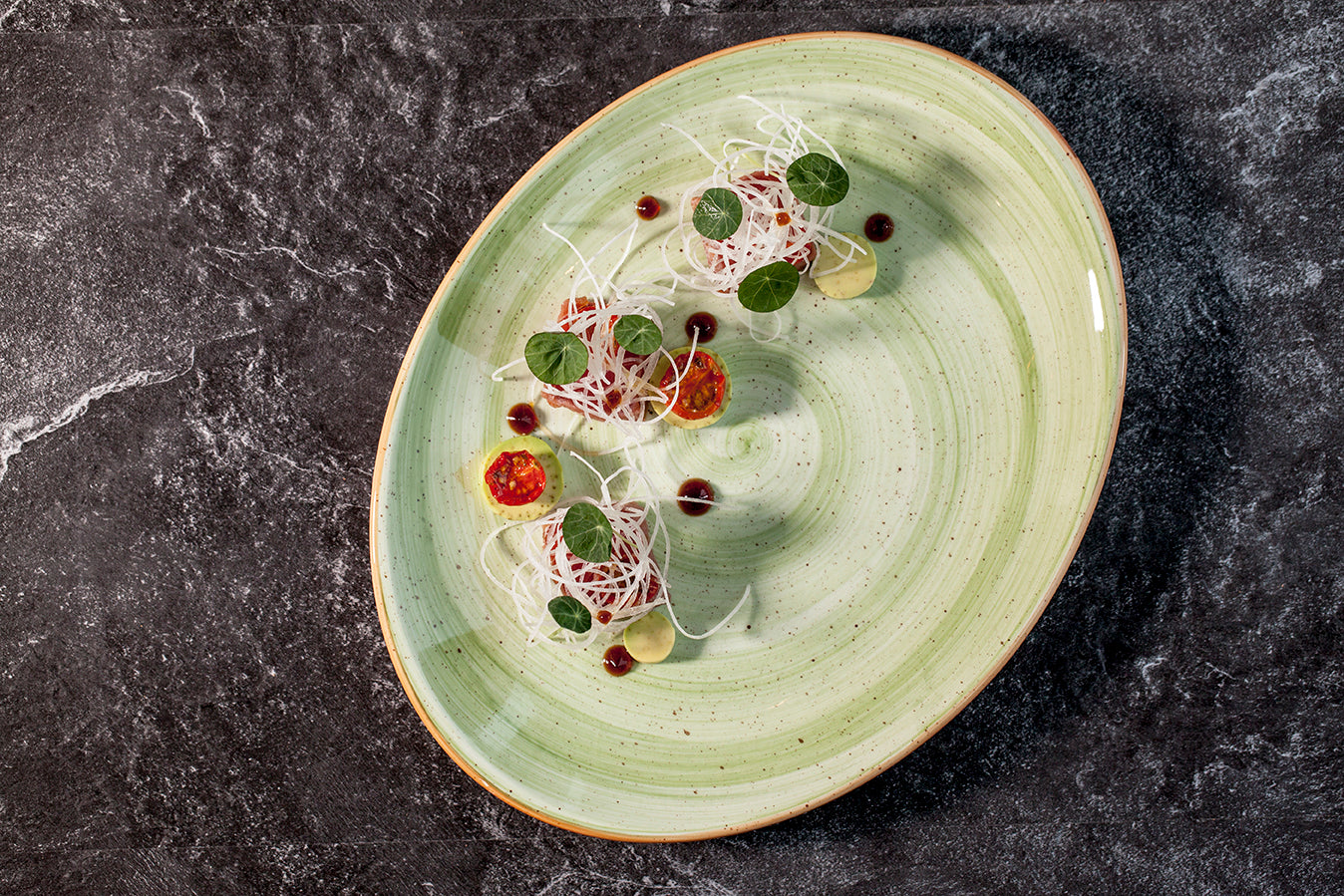 The light green tones of the hand-painted Aura Therapy tableware collection by Bonna are mixed together in different styles and patterns and further contrasted by white and brown elements. This look gives the high-quality plates, bowls, and drinkware the lightness of springtime! BO-ATHMOV36OV
