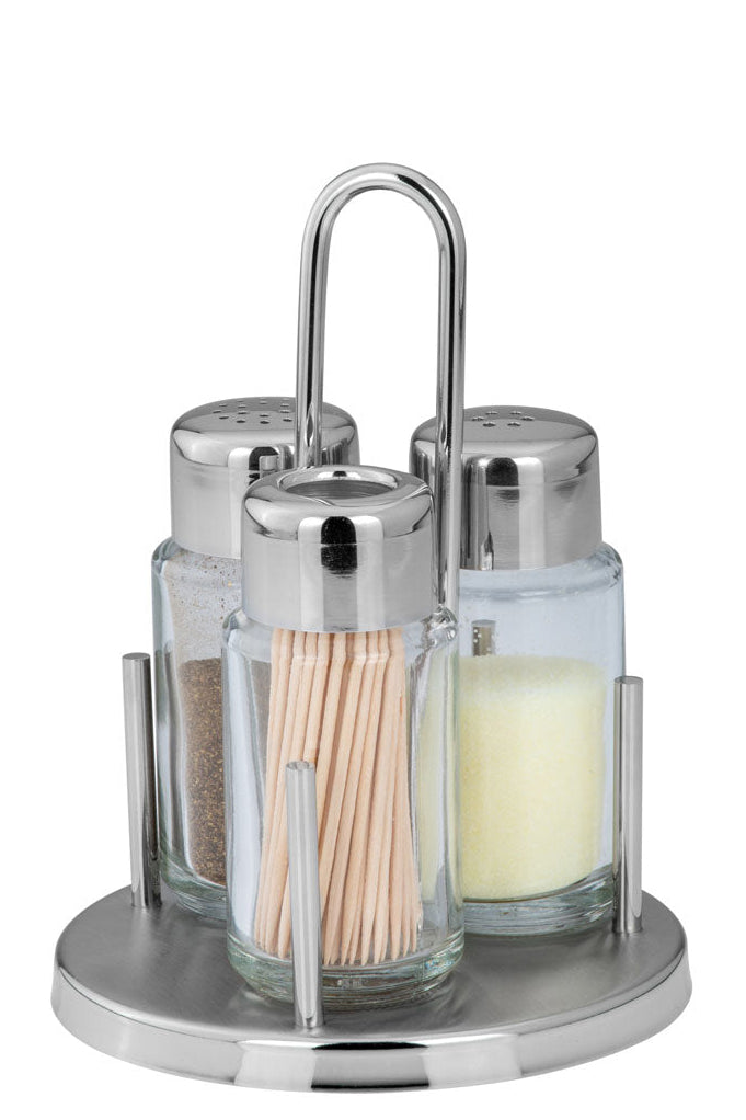 The Abert Victory salt, pepper, and toothpick holder set is durable, easy to clean, and ideal for home or professional use, adding a refined touch to any dining setting.