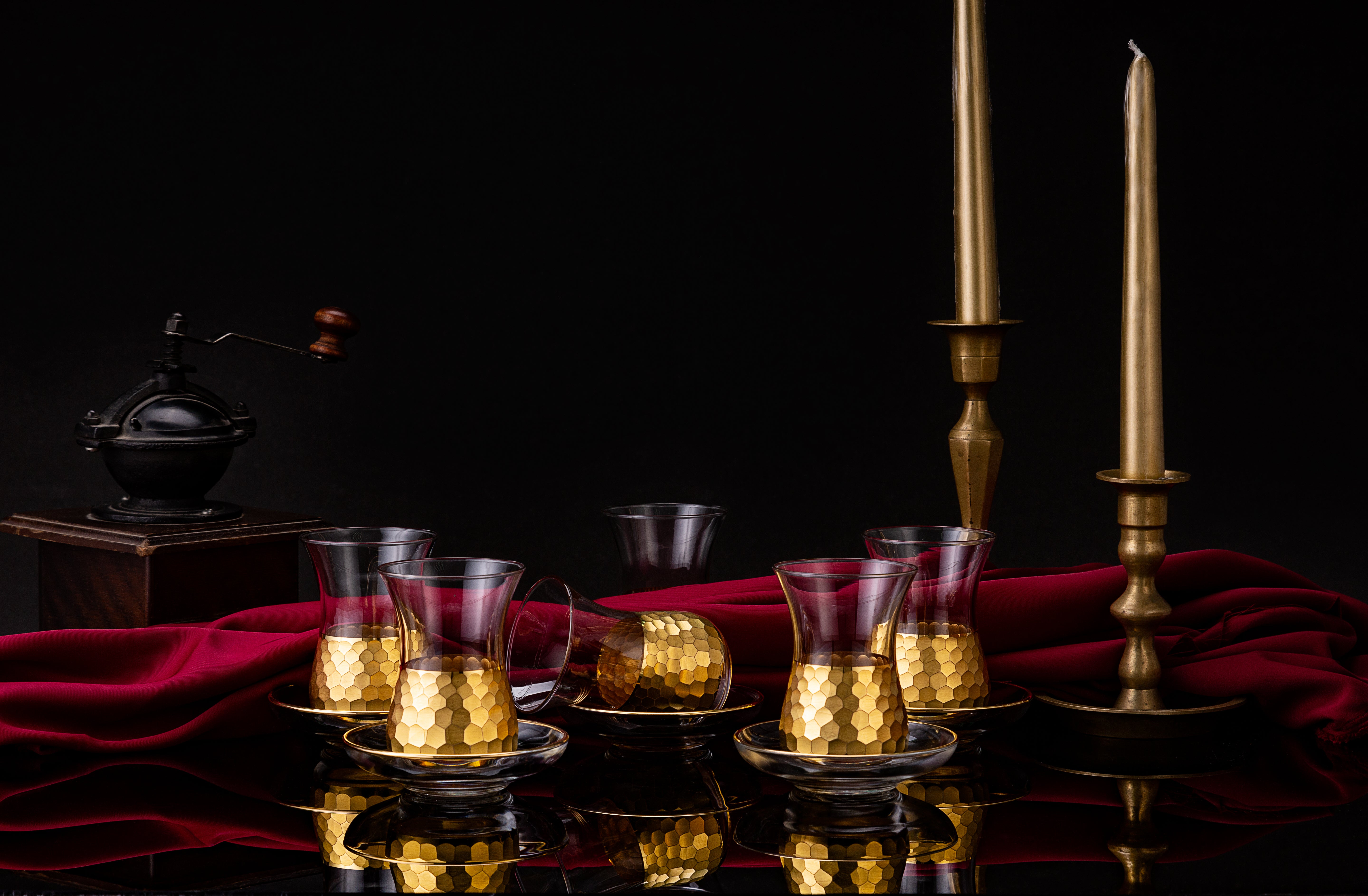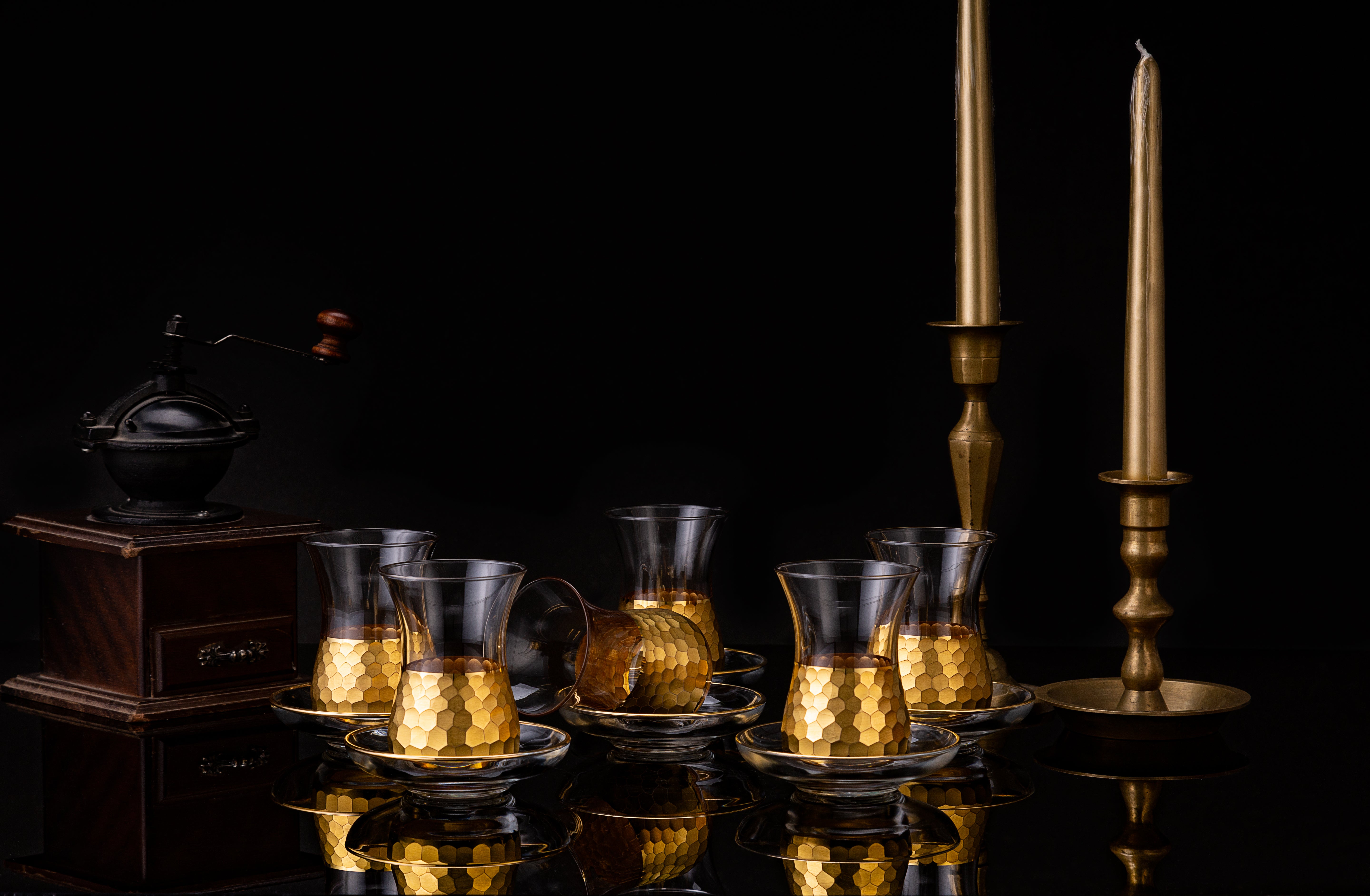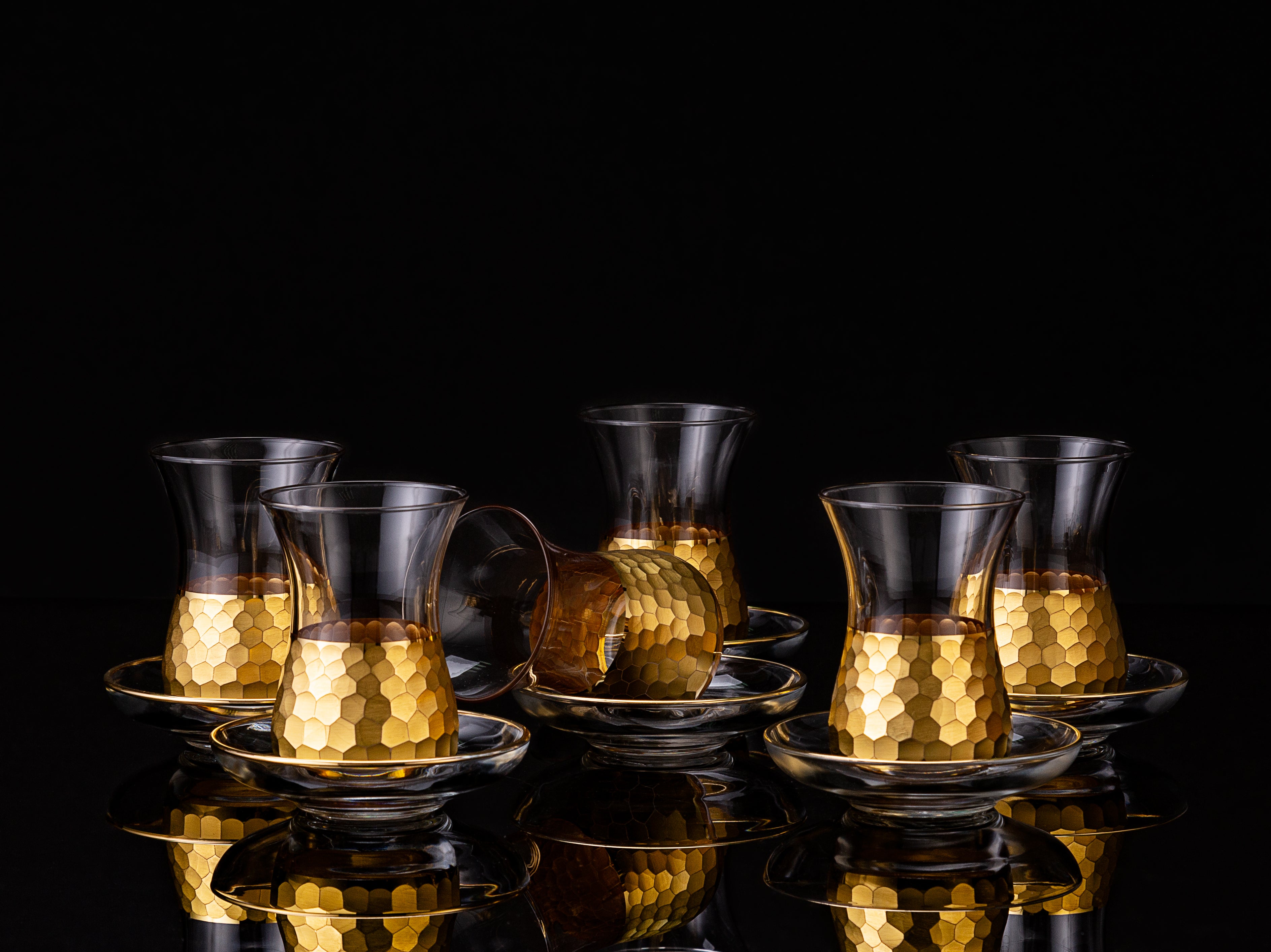 The Paşabahçe Honeycomb collection showcases careful handmade craftsmanship, finished with real gold or platinum. Set of 14 Pieces: 6 tea glasses (160 ml), 6 saucers, 1 sugar bowl, 1 tray.