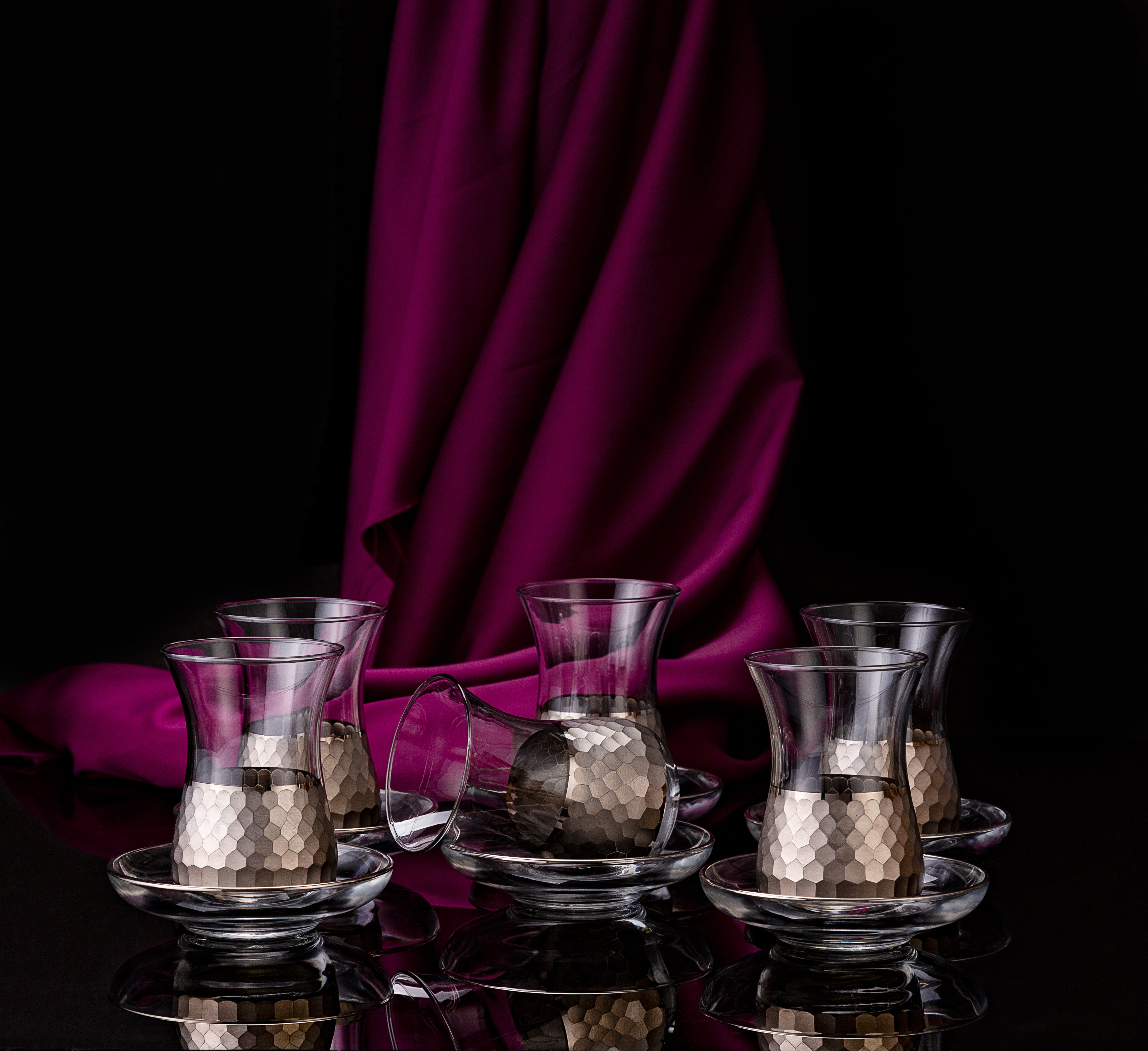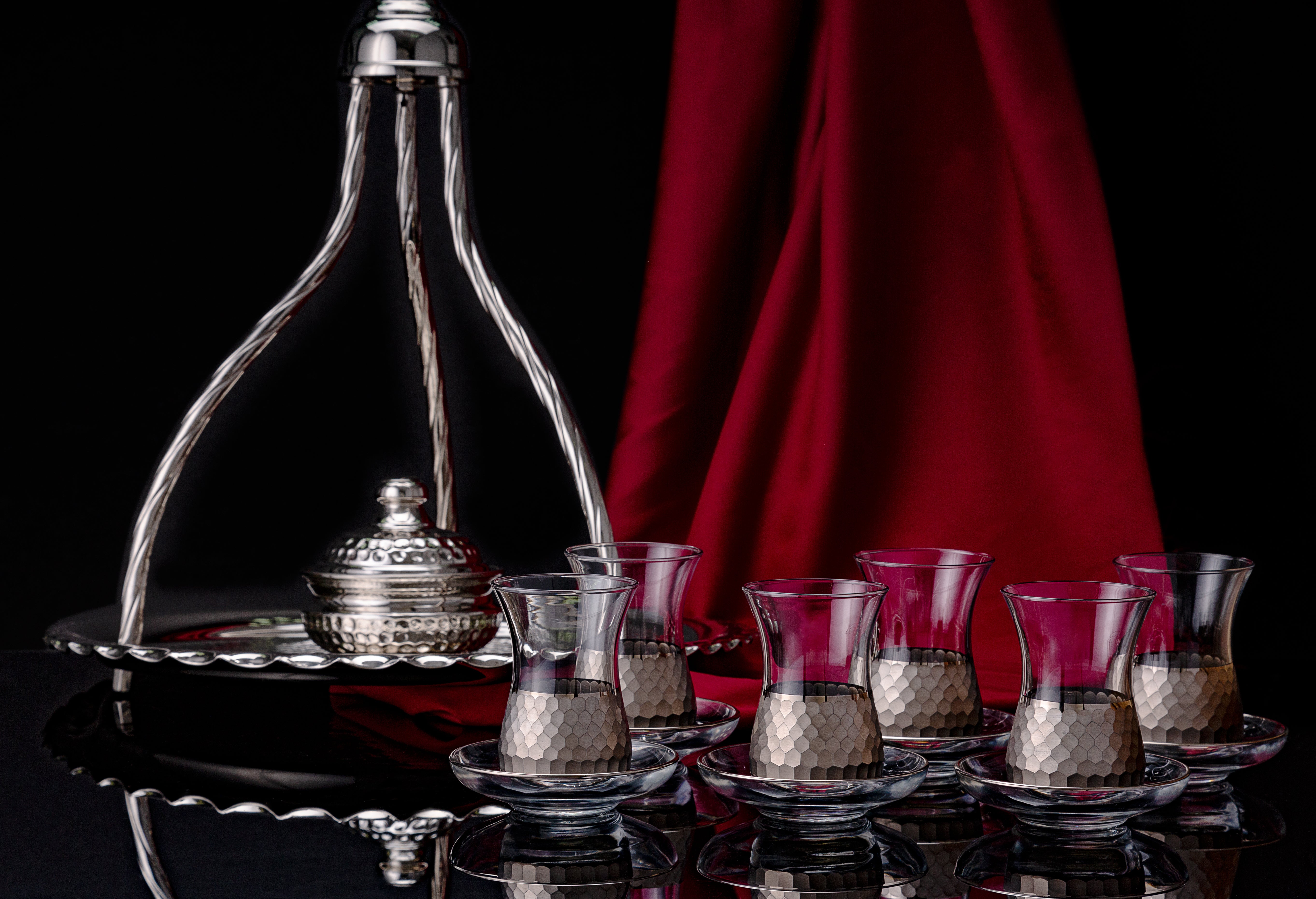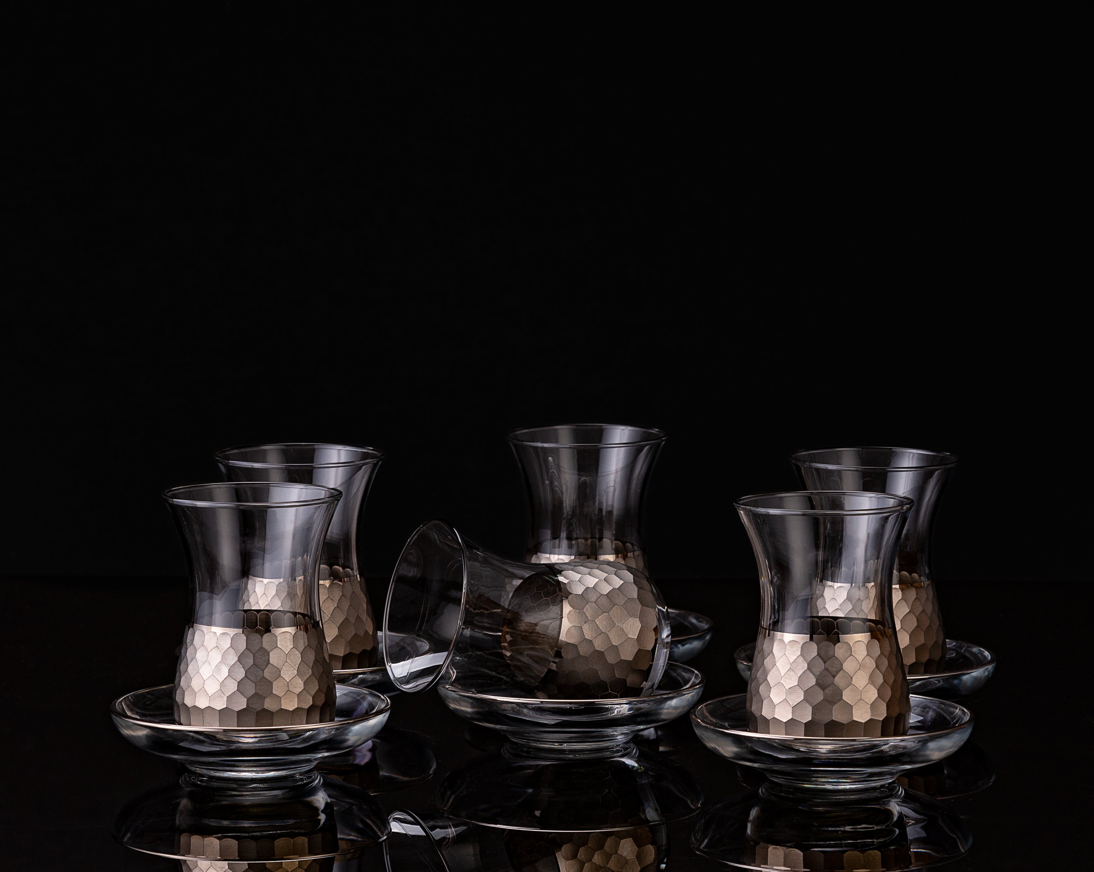 The Paşabahçe Honeycomb collection showcases careful handmade craftsmanship, finished with real gold or platinum. Set of 14 Pieces: 6 tea glasses (160 ml), 6 saucers, 1 sugar bowl, 1 tray.